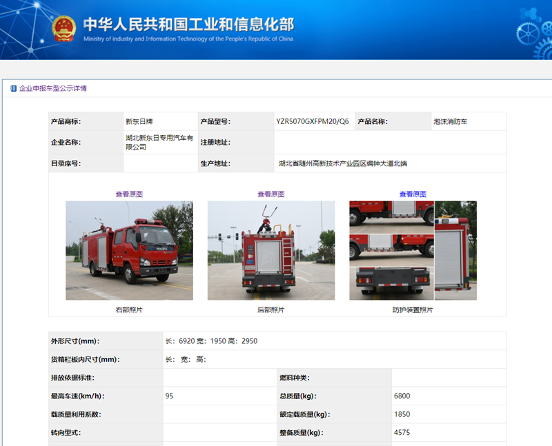 • 根據《道路機動車輛生產企業及產品公告》(第335批)擬發布內容和《享受車船稅減免優惠的節約能源使用新能源汽車車型目錄》(第十八批)公示內容中科院看到,湖北新東日消防車廠家:國六五十鈴2.5噸泡沫消防車已經公示,正式公告即將下發,有意購買國六五十鈴2.5噸泡沫消防車的用戶可以購買了。