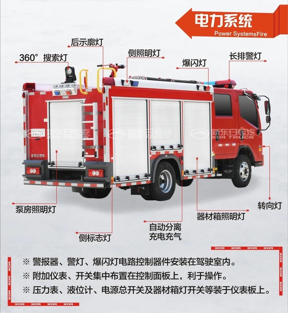 國六福田2.5噸水罐消防車,整車由消防員乘員室和車身兩大部分組成,乘員室為原裝雙排,可乘坐3+3人,該車為外漏罐結構,車身前部為水罐+器材箱,后部為泵房。載液罐體為優質碳鋼,內部做防腐處理,載水2.5立方,裝備CB10/20常壓消防泵,車頂安裝PS20型消防炮,隨車標配常用消防器材。